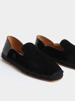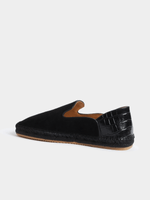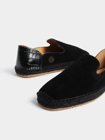 A refined take on a warm-weather classic, these espadrilles are crafted in black suede with sleek patent leather accents. The woven sole adds artisanal texture, while the versatile design allows the back to be worn flat for an easy slip-on style or worn up for a traditional fit. Sophisticated yet effortless, they transition seamlessly from casual summer looks to elevated occasions.