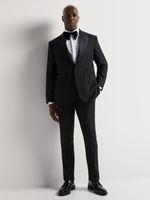 Elevate your formal look with our Fabiani Black Tuxedo Shawl Jacket. Crafted from a luxurious wool blend, this jacket exudes sophistication. With a timeless shawl design and a flattering co-ord fit, it's the perfect choice for any special occasion. Keep it looking sharp with cool iron and dry clean only.