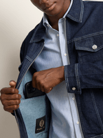 The Fabiani Men’s Blue Denim Rinse Jacket. At Fabiani, timeless essentials are refined through precision and purpose. This jacket reflects that philosophy with its deep blue rinse finish, delivering a clean, composed foundation that elevates everyday style. The structured silhouette offers confident wear, while the durable denim construction ensures lasting comfort. Designed for the man who values versatility shaped by refinement, it moves effortlessly from relaxed moments to polished casual settings.