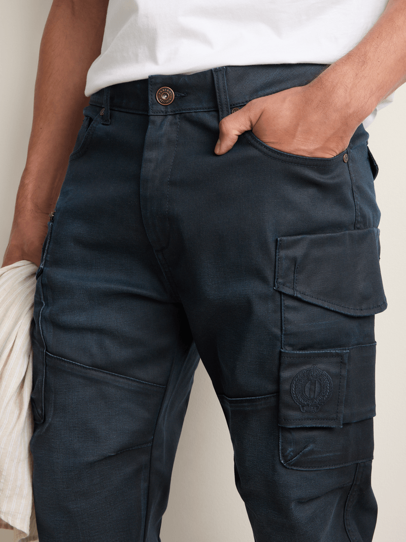 Look sharp in the Fabiani Men's Blue Slim Utility Semi-Coated Trousers. Versatile and stylish, these pants are perfect for everyday wear. Made from a comfortable cotton blend, they are easy to care for. Features warm wash, cool iron, and dry cleanable instructions. Effortlessly elevate your wardrobe with these slim-fit trousers.