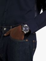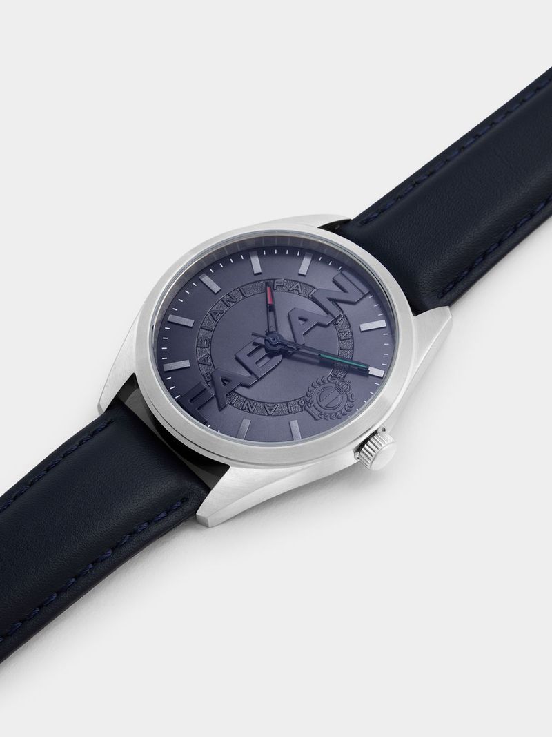 Elevate your look with this Fabiani Debossed Leather Strap Watch. The soft genuine leather strap offers a sleek silhouette paired with a bold metal case and round gun metal face featuring a debossed Fabiani logo. A Fabiani crest detail and logo on the strap buckle complete the style.