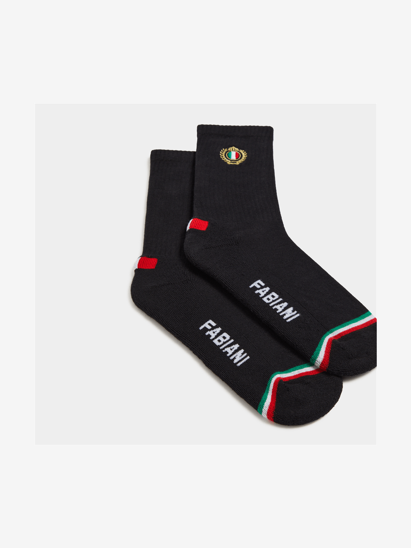 These Fabiani Embroidered Crest Shaft socks are made from soft and breathable cotton blended with stretch for comfort. The classic shaft style features a smooth footbed and a ribbed ankle, ideal for wearing with sneakers and casual footwear.
