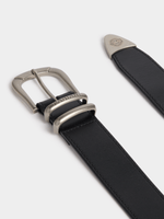 Elevate your look with the Fabiani black leather belt featuring a stylish western metal trim. Made from high-quality leather, this belt adds a touch of sophistication to any outfit. versatile and timeless. Perfect for everyday wear or special occasions. A must-have accessory for every wardrobe.