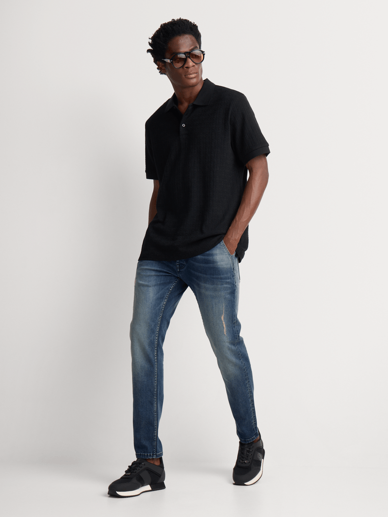 Elevate your style with Fabiani's Blue Medium Wash Denim Jeans. Made from quality denim, these tapered jeans offer a comfortable fit. Easy to care for with warm wash, cool iron, or dry cleaning. A premium brand that's always returnable. Perfect for casual or dressed-up looks.