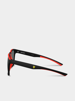 Reaching into the world of racing, this squared silhouette takes cues from the unmistakable racing car. The light, injected frame features a slender temple with the Scuderia Ferrari shield logo and a colour contrast motif, reminiscent of the car air intakes. Discover frames in deep tones with coloured, mirror or polar lenses.