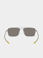Cutting a sharp, square silhouette, this double bridge sun style arrives in full metal with a sleek steel temple. Rubber temple tips recall the world of racing, complete with a Scuderia Ferrari shield logo. Coloured and mirror lenses contrast with a classic metal palette of matte black, brushed silver or dark gunmetal. Comes with a protective case or Soft pouch