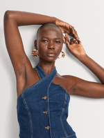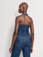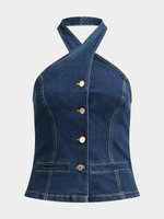 Chic and stylish, our FF Denim Halter Neck Waist Coat is a fresh update for your look. Wear this fitted top with jeans for an on-trend denim-on-denim look, or with contrast texture fabrics like a satin skirt or printed wide-leg pants.