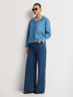 Our FF Denim Long Sleeve Fluid Denim Tunic is made from soft and flowy denim in a classic tunic style with a collar, v-neck and long sleeves. Pair it with wide-leg pants or with the matching FF Denim Back Elastic Fluid Denim Wide Leg Jeans for an on-trend coord set.