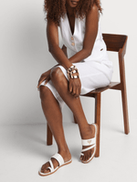 Our FF Toe Loop Slip In Sandals are comfortable flats with loads of style. The asymmetrical strap detail and metal hardware elevate the look, making them the perfect partner to wide-leg pants, smart trousers and maxi dresses.