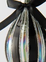 Striking and festive, our Finial Striped Ribbon Glass Bauble elevates your tree decor with classic stripes, luxe glitter, and elegant satin ribbon detail. Delicate and timeless, when hung with care and lovingly stored, glass decorations can last for generations and become future family heirlooms.