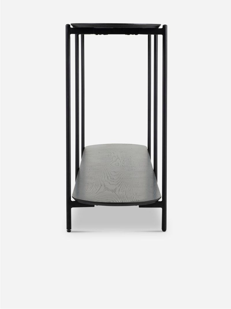 Rounded edges and a slim metal frame give the Finn Console a sleek, modern feel. Considered details like bevelled edging on the oak veneer shelves elevate your living room with effortless style. Whether used as a media stand or to display decor, Finn creates a striking focal point in any room.