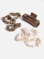 This set includes 1 claw clip & 6 satin hair scrunchies