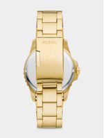 Purposeful design details define our time-honored watch collection, Fossil Blue Dive. This Gold-tone dive-style timepiece is expertly crafted with a 3-link Stainless Steel bracelet, geometric indices and a unidirectional rotating topring.