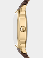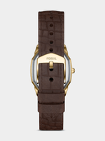 The octagonal gold-tone case and textured cream dial create a refined contrast, enhanced by a leather strap in brown croco embossing. Thoughtfully designed with a small profile, this watch blends unique geometry and warm materials for an understated statement. The stainless steel case adds structure and durability, while the leather strap ensures comfortable wear.