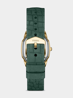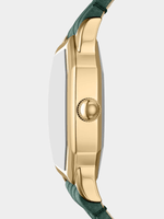 An octagonal gold-tone case frames the textured cream dial, creating a distinctive silhouette for this small watch. The green croco-pattern leather strap adds depth and character, complementing the warm tones of the case. Designed with stainless steel and leather materials, this piece balances thoughtful design with quality execution.