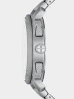 Inspired by classic American machinery, the Machine Chronograph commands attention with its bold knurled topring. Unmistakably masculine with a bold 44mm case housing a brushed black dial with textured details, all protected by a mineral crystal face. Powered by a precision quartz chronograph movement, this rugged timepiece is built to last with a durable stainless steel bracelet. A true statement in industrial-inspired design.