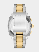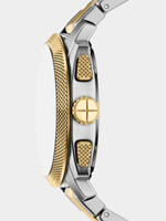Inspired by classic American machinery, the Machine Chronograph commands attention with its bold knurled topring. Unmistakably masculine with a bold 44mm case housing a brushed black dial with textured details, all protected by a mineral crystal face. Powered by a precision quartz chronograph movement, this rugged timepiece is built to last with a durable silver- and gold-tone stainless steel bracelet. A true statement in industrial-inspired design.