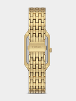 This gold-tone watch features a rectangular stainless steel case paired with a matching stainless steel bracelet for a cohesive design. The satin-finished black dial adds depth and contrast, complemented by a three-hand display and date function for added function.