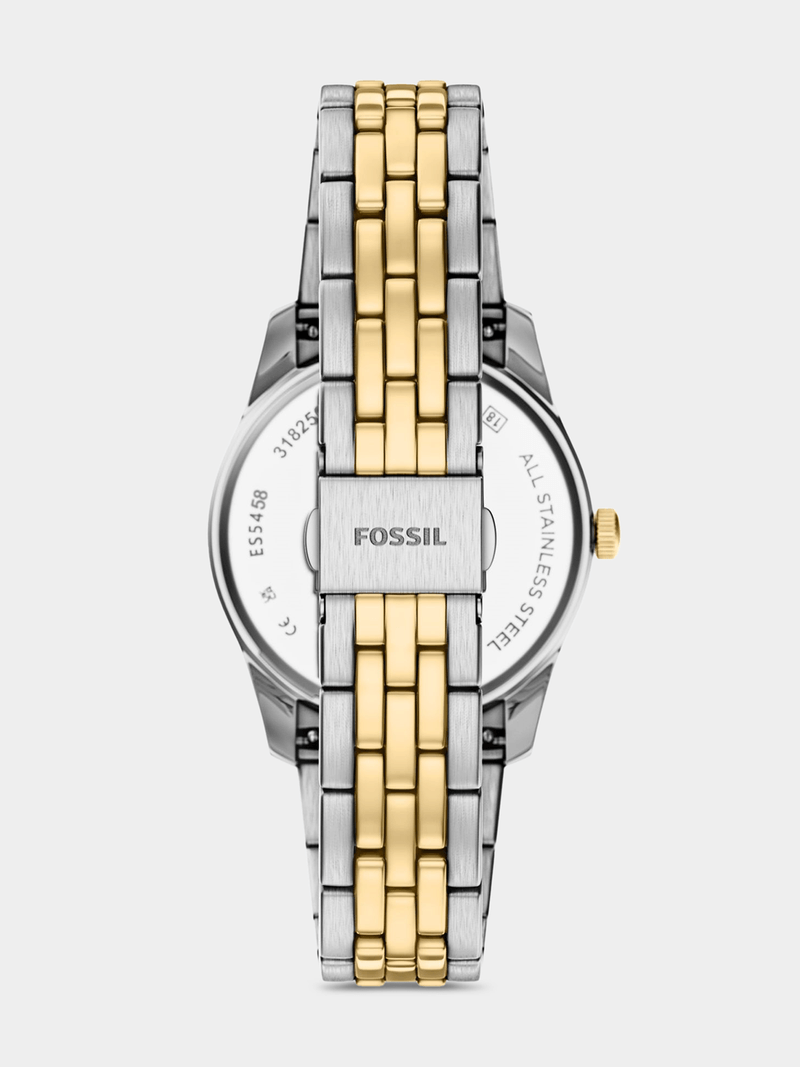 A black sunray dial anchors this two-tone stainless steel watch, featuring day and date displays for added functionality. The round two-tone silver and gold-tone case is paired with a two-tone silver and gold-tone bracelet, creating a balanced design that feels both polished and contemporary. A double-press deployant buckle ensures a secure and comfortable fit.