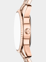 A grey sunray dial anchors this rose gold-tone stainless steel watch, featuring day and date displays for added functionality. The round rose gold-tone case is paired with a rose gold-tone bracelet, creating a balanced design that feels both polished and contemporary. A double-press deployant buckle ensures a secure and comfortable fit.