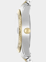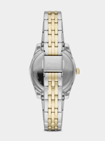 This 33mm Scarlette Mini features a gold sunray dial, three-hand date movement and a two-tone silver and gold stainless steel bracelet.