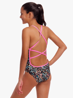 You’ll be sure to get noticed on pool deck in our strappiest one piece yet! Single strap binds that criss cross down your back with a moderately high cut leg.
