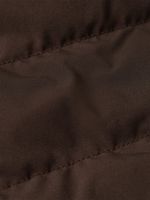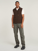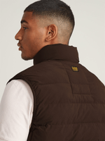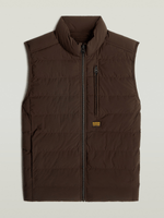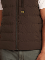 The Foundation Liner Vest is padded and horizontally stitched for warmth and structure. Designed with a raised collar, it features a zip closure, a chest pocket with zipper, and side pockets with hidden snap buttons. The armholes are finished with binding, while an inner pocket and hanger loop add functionality.