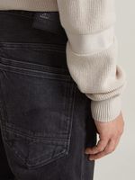 Jean Morry is designed in a relaxed tapered fit and offers a button fly. Rivet reinforced inset pockets show a flap covered coin pocket. One of the back pockets offer an additional pocket inside. Angled belt loops and seams at knee add detail.