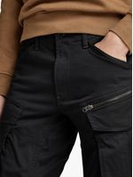 These G-Star Men's Rovic Zip 3D Regular Tapered Black Pants show cargo thigh pockets with an additional zipper pocket caught behind one of them. The integrated tape at the lower leg allows for a tighter fit around the ankles.