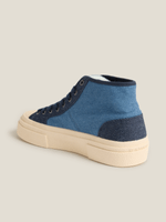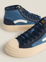 The Vodan Mid-Top Denim Sneakers combine G-Star’s signature material innovation with modern streetwear appeal. Designed in a mid-cut silhouette, they feature flat laces, metallic eyelets, and a reinforced toe cap for durability. The denim upper in navy and white adds texture and contrast, while the raised sole delivers comfort and a distinctive, urban finish.