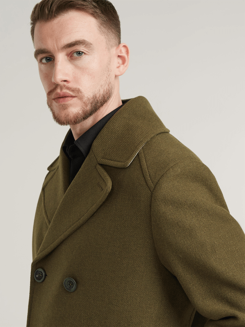 The Peacoat Wool is a timeless classic, designed with a lapel collar that can be fully closed with a side button. Featuring a double-breasted closure, broad welt waist pockets, and a secure inner pocket with a snap button. Fully lined for comfort and warmth.