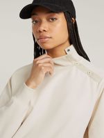 Sweater Asymmetric Button is designed in a straight fit and offers a raised neck with a V-shape. The snap buttons at the shoulder allow for an asymmetrical spread collar. Pleats are added to the elbow, creating more volume.