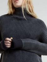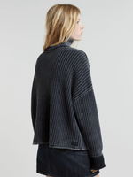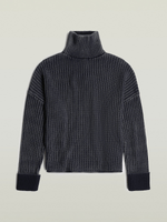 The Loose Overdyed Knitted Turtle Neck sweater features a rugged knit structure and a tall, raised collar. Folded cuffs add to the relaxed look and can be extended for extra sleeve length.