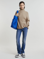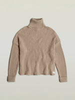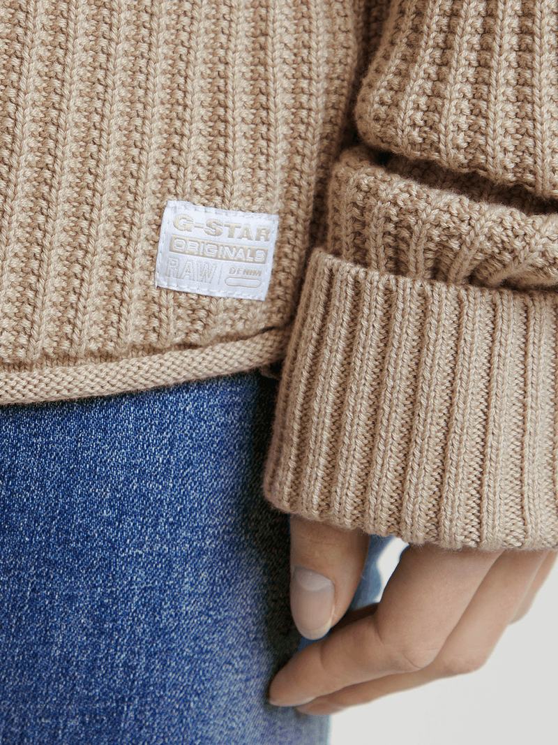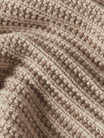 Featuring a textured, rough-knit design, this sweater offers a high raised collar for added warmth. The sleeves are styled with a folded cuff that can be unfolded to extend the sleeve length, providing versatile wear options.