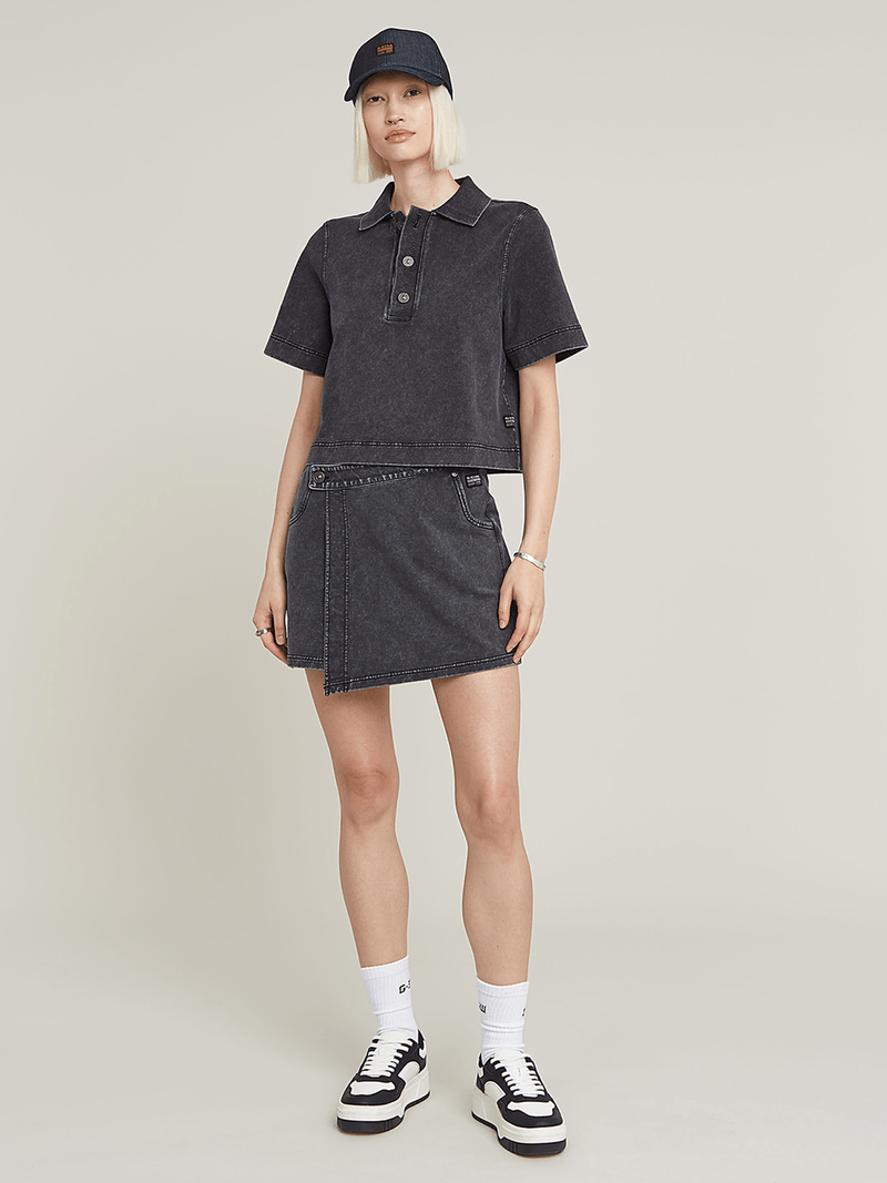 Short sleeved polo sweater Overdyed is designed in loose fit and offers a waist length. The broad placket is finished with a shank button closure.
