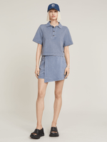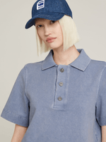 Short sleeved polo sweater Overdyed is designed in loose fit and offers a waist length. The broad placket is finished with a shank button closure.