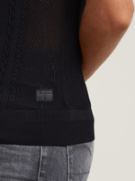Sleeveless sweater Pointelle features an engineered knitted design with partly transparent sections. Creating a different in lustre and surface. Ribbed edges complete it.