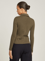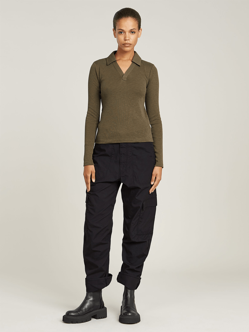 The Polo Slim is designed with long sleeves and an open polo collar for a clean, buttonless look. This design creates a wide V-neck, adding a modern twist to a classic silhouette.