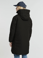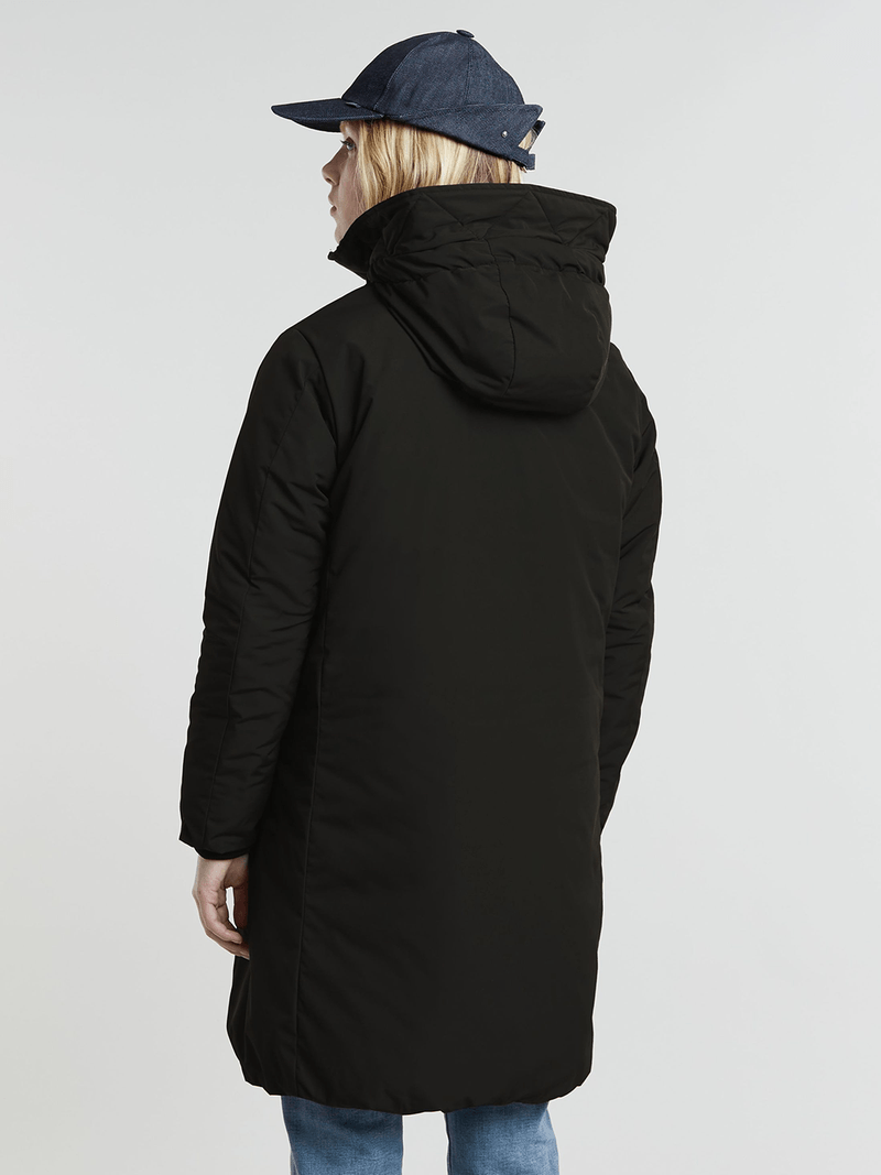 The reversible parka creates two different looks in a midi length. Offering wind and rain protection through the coated zipper and comfortable peak hood. One side offers a clean look with zipper pockets at the waist. The other side shows a stitched through design with bounded waist pockets.