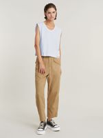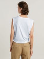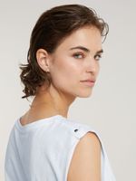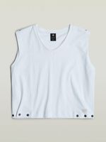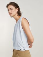 Sleeveless Riveted is cut in a loose fit and offers a shorter length. Rivets add detail to the shoulder. Fixate the snap buttons at the front to create a tighter waist with more volume.