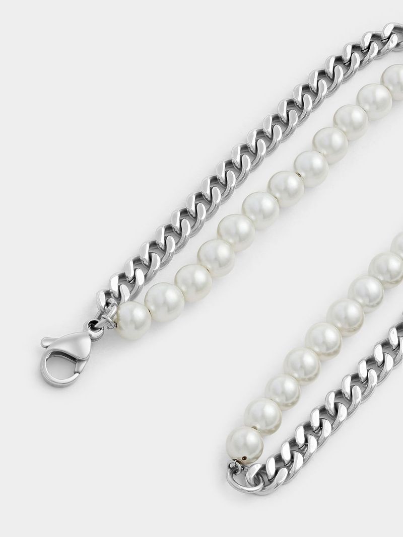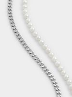 Elevate your style with this stainless steel double bracelet featuring lustrous pearls. At 21cm in length, this silver plated piece is a sleek addition to any outfit. Lightweight at 19.6g, it's perfect for everyday wear.