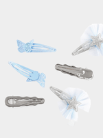 Get these fun 3-pack of decorative blue and silver hair clips for a playful look! These clips are easy to use and add a pop of color to any hairstyle. Great for adding a touch of whimsy to her hairdo. Let your child's personality shine with these fun accessories!