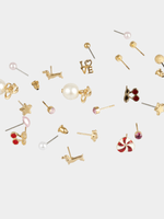 Sparkle and shine with our 15-pack earring set featuring charming cherry, carnival, and bow designs. Perfect for adding a touch of fun to any outfit, these gold stud earrings are a must-have accessory.