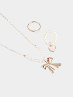 This charming gold pearl necklace and ring set is perfect for adding a touch of elegance to any outfit. With a charming balerina design, this set is sure to make a statement. Add a touch of elegance to your look with this stunning set.