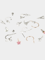 Add a touch of whimsy to your look with this 9-pack stud earring set. Featuring a mix of floral, heart, pearl, and cowboy boots designs in pretty pink and silver hues, these earrings are perfect for adding a pop of color to any outfit.