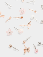 Enjoy these girly stud 15-pack earrings. Each set features butterfly, flower, heart and stud designs in shades of pink and rose gold. These earrings add a touch of chic style to any outfit, they are versatile and easy to mix and match.