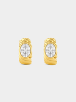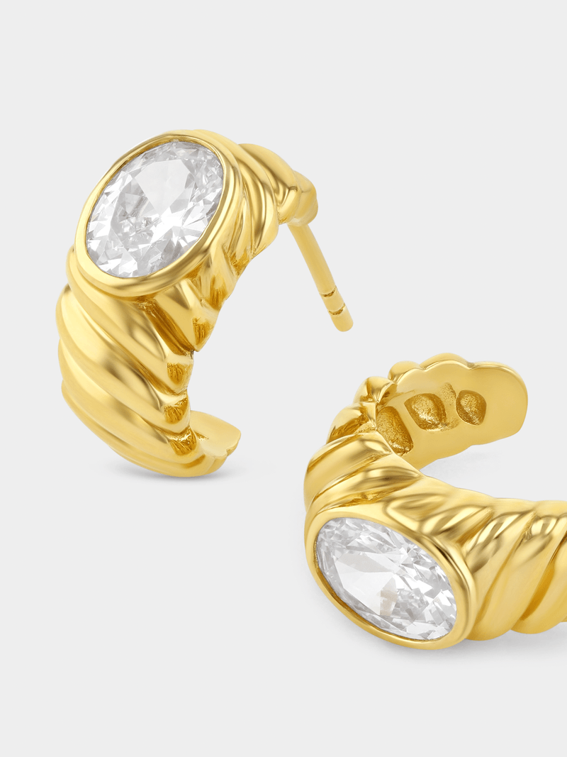 Expertly crafted in Gold Plated Sterling Silver, these bold textured hoop earrings feature oval-cut Cubic Zirconia solitaires.