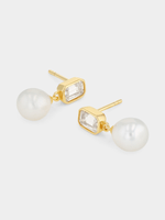 Expertly crafted in Gold Plated Sterling Silver, these opulent drop earrings feature lustrous Freshwater Pearls and catch the light with emerald-cut Cubic Zirconia solitaires.