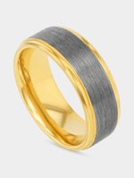 Expertly crafted in Gold Plated Tungsten, this stylish two-tone ring features a brushed centre stripe and eye-catching beveled edges. A luxurious, heavyweight and scratch resistant metal that is durable and strong.