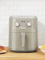 Enjoy faster and healthier cooking with the Haden 6.5L Air Fryer. Designed in Haden's signature colours to complement your kitchen, this practical appliance makes a style statement on your countertop. It features a durable body with a sleek brushed finish on the outer drawer, manual dials on the front to control temperature and time, plus convenient guides on the top for your favourite dishes and bakes.